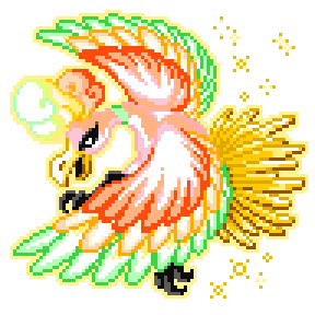 The feathers of this self fusion shine even more boldly than a standard Ho-oh's, with all seven colors visible at once. On rare occasion, the rainbows surrounding it double up, with the outer rainbow's colors showing in reverse order.