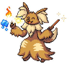 It gazes into the flame at the tip of its branch to achieve a focused state, which allows it to see into the future. An Eephox has an unstable genetic makeup that suddenly mutates due to its environment.