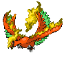 Ho-tres is a legendary bird Pokémon that can control fire. Its feathers--which glow in seven colors depending on the angle at which they are struck by light--are thought to bring joy.